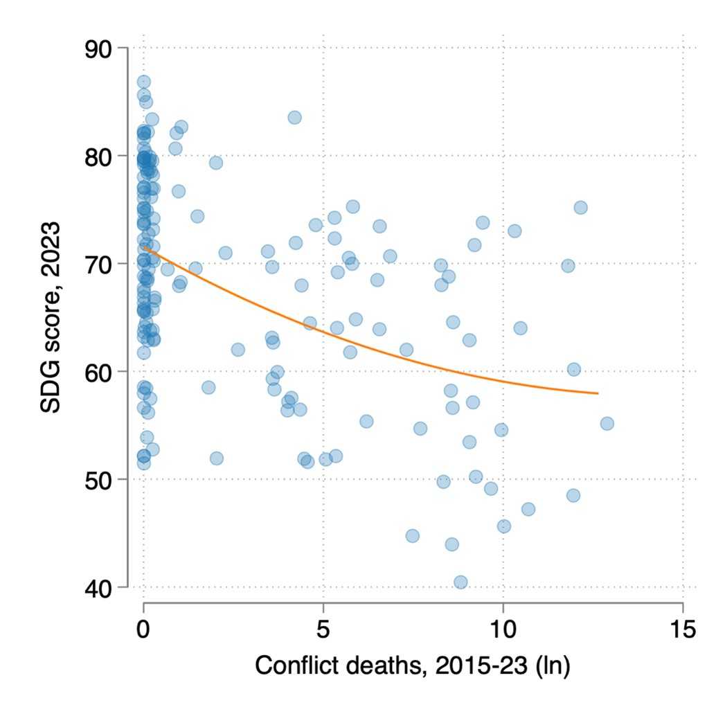 Where peace is absent, sustainability is undermined on every front. Conflict disrupts economic activity, destroys health systems, and forces children out of school. Social trust and democratic institutions erode. Forced migration, material destruction, and the loss of critical expertise and capital deepen the damage. As the figure below shows, countries affected by a major conflict consistently rank low on the SDG index (a ranking that measures countries’ progress toward the goals), whereas those scoring high have, almost without exception, avoided major conflict in recent decades.