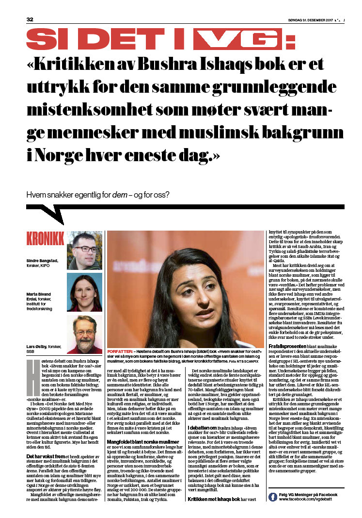 Erdal, Marta Bivand & Sindre Bangstad (2017) Hvem snakker for dem - og oss?, Verdens Gang. 29 December.