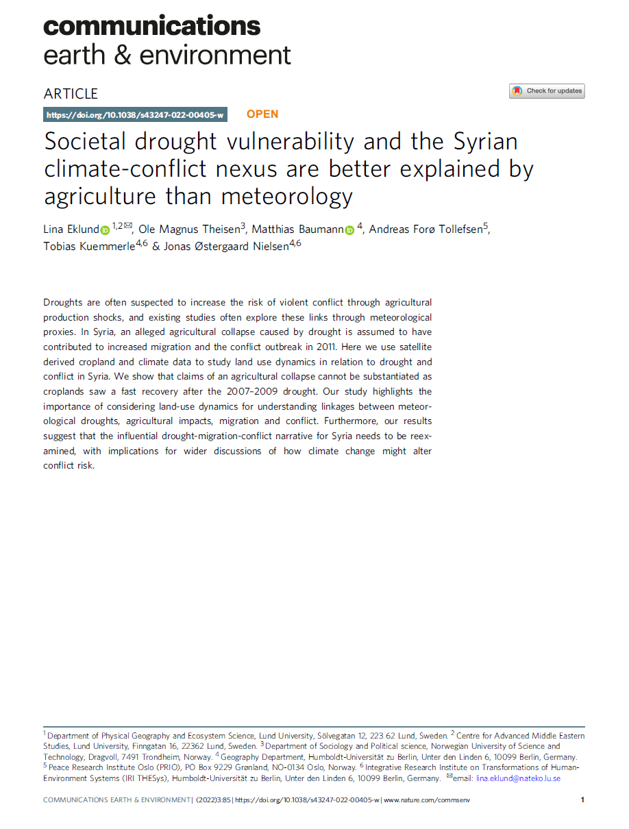 Eklund, Lina; Ole Magnus Theisen; Matthias Baumann; Andreas Forø Tollefsen; Tobias Kuemmerle & Jonas Østergaard Nielsen (2022) Societal drought vulnerability and the Syrian climate-conflict nexus are better explained by agriculture than meteorology, Communications Earth & Environment 3: 1–9.