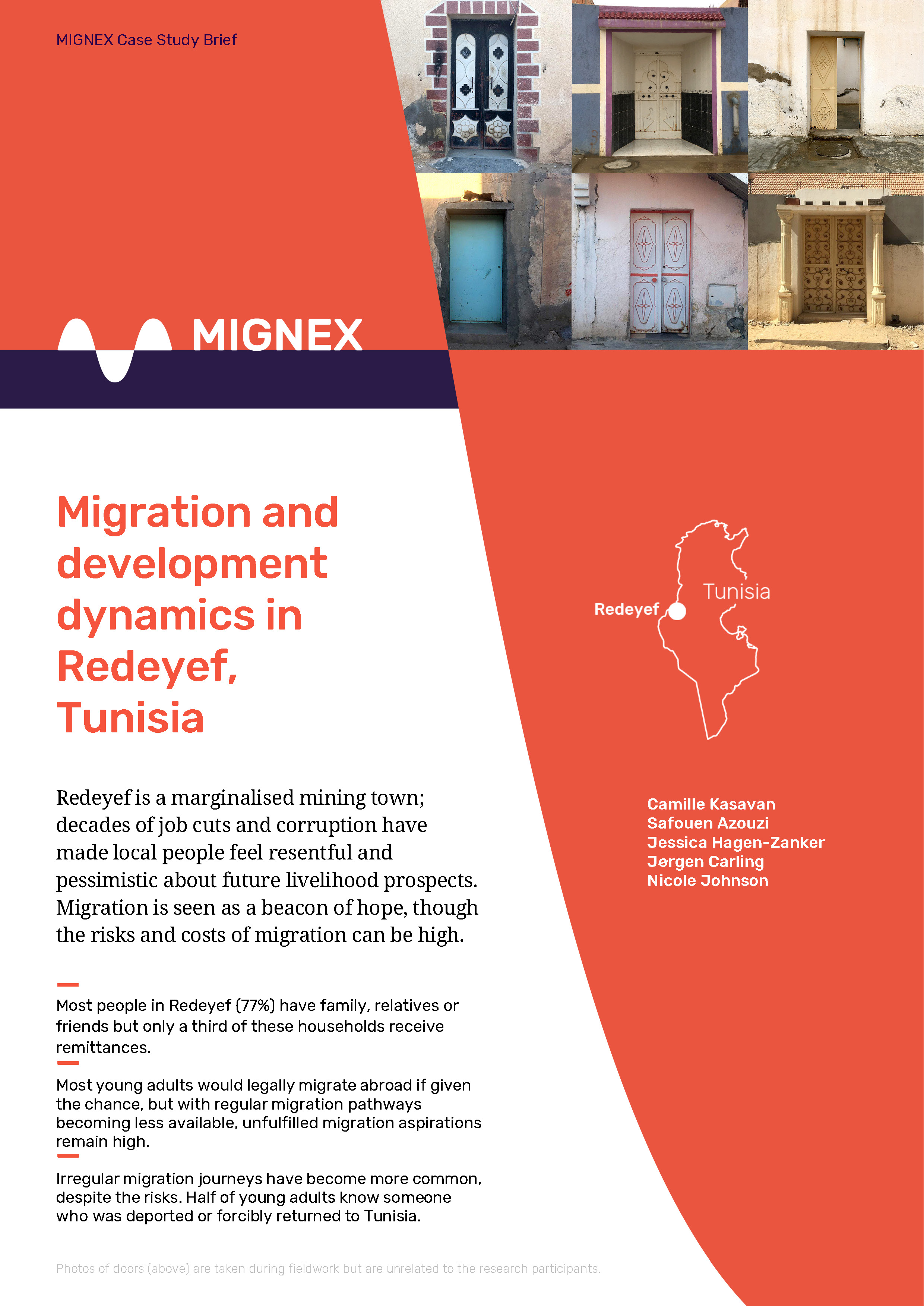 Kasavan, Camille; Safouen Azouzi; Jessica Hagen-Zanker; Jørgen Carling & Nicole Johnson (2022) Migration and development dynamics in Redeyef, Tunisia. MIGNEX Case Study Brief. Oslo: Peace Research Institute Oslo.