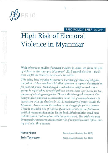 This policy brief explains Myanmar's increasing problems of religious and ethnic violence and anti-Muslim agitation as aspects of competition for political power. Underlying distrust between religious and ethnic groups is exploited by powerful political actors to stir up violence for the purpose of winning swing votes. There is therefore good reason to alert policy makers and local communities to the risk of renewed violence in connection with the elections in 2015, particularly if groups within the Myanmar Army involve themselves in the struggle for political power. There is an added risk of violence if ethnic-minority parties fail to win political representation at the Union level. Ethnic militias could then initiate armed confrontation with the government. The brief concludes by suggesting measures to reduce the risk of renewed violence before, during and after the elections.